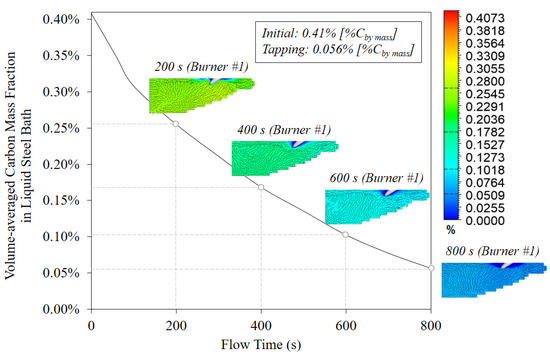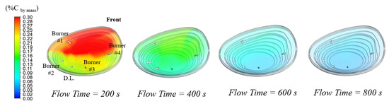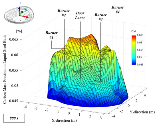 Compared with other models, the current proposed 3D integrated model can analyze the detailed variation of the carbon distribution inside the liquid steel bath using the CFD technique. The simulation results are plotted in Figure 12. It can be seen that the current burner arrangement will result in an uneven carbon distribution in the liquid steel bath and the decarburization rate in front part of the furnace is much slower than elsewhere. When the refining progresses reaches around 200 s (about 3 min), the average carbon content in front part of the furnace is about twice higher than that of other places. It is not difficult to tell from the arrangement of the burners that most of the burners are located in the middle or rear of the furnace, which leads to the issues including the weak stirring and less oxygen injection in front of the furnace. The decarburization in this front area mainly depends on the overall flow pattern in the bath, that is, the liquid steel carrying high carbon content flows from the front of the furnace to the middle and rear of the furnace under specific rotating pattern so that the carbon content can be reacted with rich oxygen injected from the burner in that area. Obviously, this way of decarburization highly depends on the overall bath flow pattern and has a relatively low decarburization rate in the front of the furnace, which may result in a potential issue.