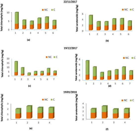 Pigment content variation according to vertical centrifugation and collecting period. (a) chlorophyll content variation in olive oils of 22/11/2017; (b) carotenoid content variation in olive oils collected at 22/11/2017; (c) chlorophyll content variation in olive oils at 19/12/2017; (d) carotenoid content variation in olive oils of 19/12/2017; (e) carotenoid content variation in olive oils collected at 19/01/2018; and (f) carotenoid content variation in olive oils of 19/01/2018. NC: Before vertical centrifugation, C: After vertical centrifugation.