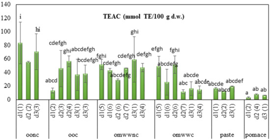 Trolox equivalent antioxidant capacity variation in olive oil, paste, and by-products. d1: 22/11/2017, d2: 19/12/2017, d3: 19/01/2018, oonc: Olive oil before vertical centrifugation, ooc: Olive oil after vertical centrifugation, omwwnc: Olive mill wastewater before vertical centrifugation, and omwwc: Olive mill wastewater after vertical centrifugation. (a-h) The different letters indicate a significant difference (Duncan’s test, p < 0.05) values are expressed as mean values and standard deviations over three repetitions.