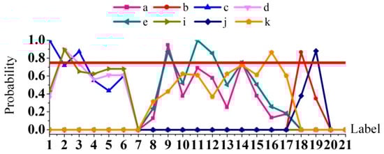 The probability distribution of the several unknown loads separated from load separation parts is shown in Figure 7. It shows the label probability of one load belonging to each category of electrical appliances in the experiment, and quantifies the possibility of the load category by the label probability. The label corresponding to the maximum probability is determined as the category label of the load. The threshold ν of unknown class is denoted by the red straight line. If the maximum label probability is still lower than the threshold line, the load will directly be placed in the “unknown load” category.