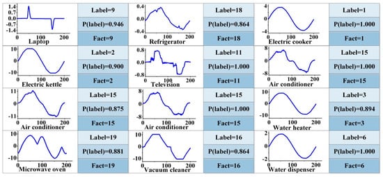 The probability of possible load labels under their pre-classification is shown in Figure 7. The probability outside their pre-classification is 0. In this paper, the label with the highest probability in the pre-classification of unknown loads is regarded as the result of its category. The waveforms and label probability results are shown in Figure 8. It compares the labels and their probabilities for unknown loads with their real labels. It can be seen that the waveforms are labeled correctly.