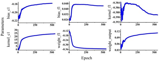 Figure 11 illustrates the parameters of the convergence process in the model. Six parameters are selected for display. The parameters kernel_c1 and bias_c1 are one of the weights and one of the biases in the second convolution layer, respectively. The parameters kernel_f1 and bias_f1 are one of the weights and one of the biases in the third convolution layer, respectively. Besides, weight_f1 is one of the weight parameters between the third convolution layer and the fully connected layer. The parameter of weight output is one of the weights between the fully connected layer and the softmax layer. The detailed values of the above six parameters under different epoch times are shown in Table 5.