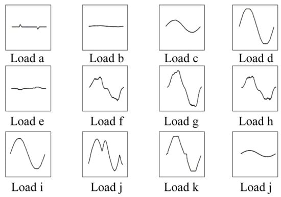 Figure 6 shows the current separation signal of the load in the experimental environment, and gives the template current for comparison. Blue lines denote the current separation signals which are the periodic current waveforms operating in a stable state separated by the method in Section 3.1.1. Red lines denote the standard currents which are obtained by only switching on a single electrical appliance in the experiment. The high coincidence between the separated signal and the standard current indicates that the load separation has high accuracy. Since the categories of separated load waveforms are unknown before the load labeling, a-l is used to represent the waveforms of loads in this paper.