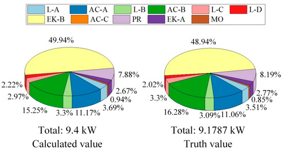 In order to present the accuracy of results of the proposed method, the collected data of day1–day3 are identified by the proposed method, and the power consumption ratio of different loads is presented in Figure 15. As a comparison, smart sockets are installed to the monitoring appliances to obtain the true power consumption, which is shown in the right part of the figure. It can be seen that the total consumption difference between the calculated one and the true one is less than 0.3 kW. The consumption ratio of each load is nearly the same as the true value given by the socket, and the load has the correct label.