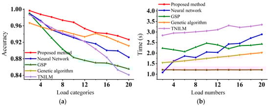 Performance comparison of algorithms. (a) Load identification accuracy comparison of different algorithm under different category numbers; (b) Operation efficiency comparison of different algorithm under different load numbers.