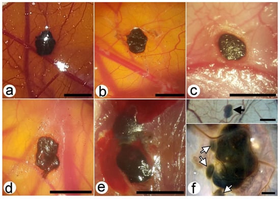 - Nowak-Sliwinska, P.; Segura, T.; Iruela-Arispe, M.L. The chicken chorioallantoic membrane model in biology, medicine and bioengineering. Angiogenesis 2014, 17, 779–804. [Google Scholar] [CrossRef]