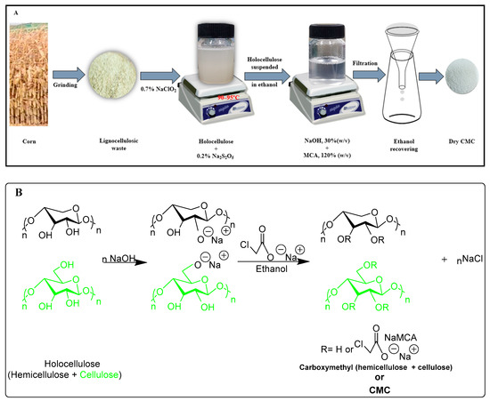 The outline of the mechanism for preparing CMC from holocellulose of corn wastes followed by two consecutive steps including basification as well as etherification are documented in Figure 1.