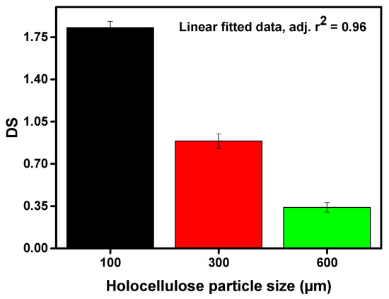 The highest yield (i.e., 182.55%) of CMC was found with the lowest particle size of holocellulose i.e., 100 µm, whereas the yield declined with increasing particle size of holocellulose (Figure 3). One might postulate that we have reported a higher yield of CMC in this study. This was highly desirable as the anhydrous glucose unit (molecular weight 162 g/moL) substituted into the sodium carboxymethyl groups (molecular weight 80 g/moL) based on the DS value. Therefore, the higher yield was highly desirable. However, we did a theoretical calculation and compared the data with the experimental findings. We found that theoretical yield was slightly higher (i.e., 7.0–8.6%) for theoretical mass yield, which indicated that successful substitution of the hydroxyl groups occurred by the sodium carboxymethyl groups. This result shows the resemblance with the principle that the reduced particle generates a larger surface area, which increases the chance of collisions between reactants and holocellulose. Therefore, the yield of CMC was increased by decreasing the holocellulose particle sizes [27].