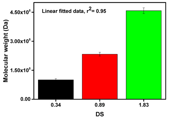 From Figure 4, it can be noticed that the molecular weight of the prepared CMCs was significantly increased with the increasing DS value. From Figure 2, it was mentioned that the DS value was increased with the decreasing of holocellulose particle size. Since the smaller holocellulose particle size has a greater surface area, the excessive amount of reactants can infiltrate into the holocellulose at a time. In addition, Wang et al. mentioned that the etherification process significantly relies on the availability of the activated hydroxyl groups of AGU as well as the approachability of reactants [28]. Thus, higher DS, as well as molecular weight, were obtained due to the increasing number of -OH groups substituted by the sodium carboxymethyl group. The highest molecular weight of 457,910 Da was obtained with DS value of 1.83, whereas the lowest molecular weight of 100,388 Da was yielded with DS value of 0.34, as depicted in Figure 4. The molecular weight of the AGU was 162 g/mol, and the net gain in the AGU for every substituted sodium carboxymethyl group was 80 g/mol. Likewise, the carboxymethyl group is weightier than the -OH group, hence, the molecular weight of the CMC increased [23].