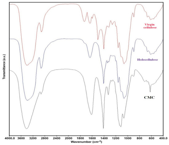 Structural properties of holocellulose and CMC (with degree of substitution 1.83). FTIR spectra of virgin cellulose, isolated holocellulose, and synthesized CMC.