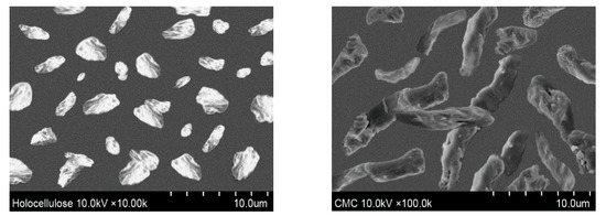 For the characterization of cellulose-based materials, SEM is one of the general techniques for imaging the microstructure and morphology of the materials. The morphologies of isolated holocellulose and synthesized CMC were also observed using an optical microscope, depicted in Figure 6. Ribbon shaped or rod-like morphology was found for the synthesized CMC, which is similar with the reported literature [33]. Furthermore, from Figure 6, it can also be observed that the surface morphology of extracted holocellulose is smoother with very low damage. In contrast, the morphology of the prepared CMC was more extended, rough, and collapsed [34]. In addition, the isolated holocellulose was further treated with sodium hydroxide during carboxymethylation, thus the ruptured surface was obtained from the synthesized CMC [35]. From Figure 6, it can be found that the size of the particles of holocellulose and CMC were in the range of 1.0–3.5 and 1.5–3.5 μm (approximately), respectively.