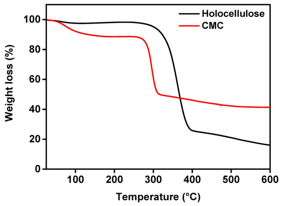 TGA is a technique by which the thermal stability of a material can be analyzed, where the material is decomposed by the heat, and bonds are broken within the molecule [41]. During the test, when the maximum degradation occurs at a certain temperate, it is considered as an indicator of the stability of the material. The TGA graph of holocellulose and CMC is shown in Figure 8. From the figure, the weight loss of moisture, volatile compounds, and carbohydrate polymers during the carbonization phase can be observed.
