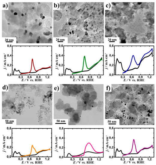 Transmission electron microscopy images and anodic scan of cyclic voltamperograms of (a) Pt/C; (b) PtNiO/C; (c) PtSnO2/C; (d) PtTiO2/C; (e) PtRh/C; and (f) PtIr/C catalysts in 0.5 M H2SO4 in the presence of adsorbed CO at E = 0.3 V (RHE), potential scan rate 20 mV·s–1.