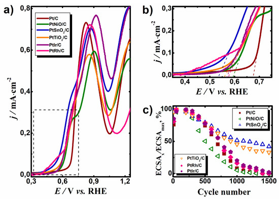 The stability of the synthesized catalysts was investigated by cycling in 0.5 M H2SO4 over a potential range of 0.05–1.3 V vs. RHE. Figure 3c shows the dependence ECSA of the catalysts, which was normalized to the maximum ECSA of catalysts from the cycle numbers. For the first 100 cycles, the value of the ECSA increased due to the purification of the platinum surface. However, after the 300th cycle, a decrease in the ECSA of all samples was observed. After a long-term cyclic stability test, the largest decrease in ECSA was observed in the Pt/C, PtNiO/C, PtRh/C, and PtIr/C samples. The fact is that the stability of the electrocatalyst in the FC is largely dependent on the stability of the catalyst support. As electrocatalysts work under very hard conditions, in the presence of the active component of the catalyst, carbon support oxidation occurs, which causes a loss of active component contact with the carbon support and thus the active component is out of the reaction zone [22]. It is assumed that the introduction of a metal oxide in the support will have a positive impact on the electrocatalyst’s durability. The catalyst based on the hybrid support containing SnO2 or TiO2 was significantly more stable. The value of the ECSA after 1500 cycles decreased to 58% and 40% for PtSnO2/C and PtTiO2/C, respectively. The behavior of the PtNiO/C electrocatalyst was the same as the Pt/C catalyst, but the rate of catalyst degradation was somewhat higher than that of Pt/C, which is probably due to the solubility of nickel oxide in the acidic medium.