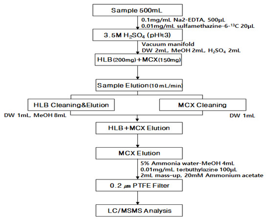 Samples were collected and cleaned for a liquid chromatography-tandem mass spectrometry (LC-MS/MS; Agilent 1200–6410 series, Santa Clara, CA, USA) assay (Figure 1). First, 500 μL of 0.1 mg/mL Na2-EDTA (Sigma-Aldrich, St. Louis, MO, USA) and 20 μL of 0.01 mg/mL sulfamethazine-6-13C (Cambridge isotope laboratories, Tewksbury, MA, USA), which is an isotopically labeled standard for sample clean-up, were added to a 500-mL centrifuged and filtered (glass microfiber filter (GF/B), 1 μm; Whatman, Maidstone, UK) sample, and 3.5 M sulfuric acid (Wako Pure Chemical, Osaka, Japan) was used to adjust the pH level to 3. Oasis HLB (200 mg, 6 cc; Waters, Milford, MA, USA) and Oasis MCX (150 mg, 6 cc; Waters, MA, USA) cartridges were mounted on the vacuum decompression unit and the sample was prepared by releasing 2 mL ultrapure water and 2 mL methanol (J.T. Baker, Phillipsburg, NJ, USA), and allowing 2 mL sulfuric acid to pass through. The HLB cartridge, being placed on top, was connected to the MCX cartridge, and the sample was released at a rate of 10 mL/min. The samples that passed through the cartridges were separated. The HLB cartridge was washed with 1 mL ultrapure water before being eluted with 8 mL methanol. The MCX cartridge was washed with 1 mL ultrapure water, and the two cartridges were reconnected for elution with 2 mL and, subsequently, 6 mL of methanol. Next, the HLB cartridge was removed and the MCX cartridge was re-eluted with 4 mL 5% ammonia water–methanol solution. Eluent concentrate was prepared using a nitrogen evaporator, and 100 μL of 0.01 mg/mL terbuthylazine (Sigma-Aldrich, MO, USA), which is a syringe reference material, was added. The concentrate was filled with 20 mM ammonium acetate (pH 9; Sigma-Aldrich, MO, USA) up to 2.0 mL, and the residue was dissolved. The sample was filtered using a 0.2 μm syringe filter (Sartorius, Göttingen, Germany) and prepared for analysis. Considering the properties of compounds, the pretreated samples were divided into two groups for analysis purposes: Group 1 for sulfamethazine and sulfathiazole; and Group 2 for chlortetracycline and oxytetracycline. A scan mode was applied to examine the mass spectrum and a precursor ion was then selected. In addition, product ions and characteristic ions were selected for the multiple reaction monitoring analysis (Table 4).