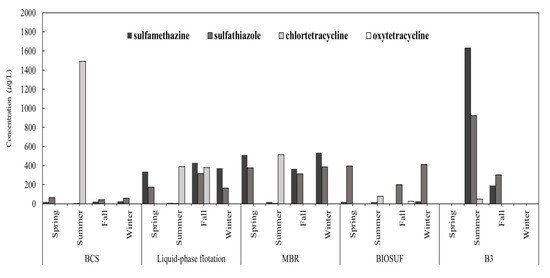 The antibiotics investigated in this study are not used for promoting livestock growth because, in 2011, the Korean government banned the inclusion of antibiotics in livestock feed as growth promoters [21]. Specific pharmaceuticals are used to prevent seasonal epidemics depending on the pathogen. This study conducted an analysis of influent samples to determine seasonal usage behaviors for pharmaceuticals (Figure 2). The seasonal concentrations detected in influents were investigated for different pharmaceuticals, and the results showed that no seasonal concentration differences were found in sulfamethazine and sulfathiazole. The mean seasonal concentrations of sulfamethazine detected in influents were 221.3 μg/L in spring, 332.8 μg/L in summer, 203.0 μg/L in fall and 239.5 μg/L in winter, and for sulfathiazole they were 188.5 μg/L in spring, 236.2 μg/L in summer, 255.5 μg/L in fall and 252.1 μg/L in winter, ranging from 180 μg/L to 330 μg/Lt regardless of the season. No chlortetracycline concentrations were detected in spring and winter, and the mean concentrations were 504.5 μg/L and 379.7 μg/L in summer and fall, respectively. Oxytetracycline was detected only one time in fall. The seasonal characteristics of the chlortetracycline inflow rate can be attributed to the effects of its increased consumption for preventing E. coli and Salmonella, which are susceptible to chlortetracycline, during summertime, when incidence of these diseases is highest.