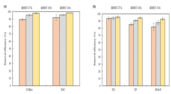 Removal efficiency of (a) organic matter and (b) nitrogen and phosphorus by HRT (n = 9).