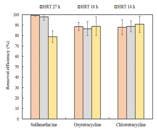 The efficiency of the removal of antibiotics by HRT is shown in Figure 4. The influent concentration of sulfamethazine ranged from 3.4 to 262.7 μg/L, with a mean concentration of 106.6 μg/L. Sulfamethazine was detected in all samples of influents, showing a large variation in concentration. The highest removal efficiency of sulfamethazine was observed at HRT = 27 h (99.4%), followed by 97.8% at HRT = 18 h, and 78.9% at HRT = 14 h. The observation of a ≥20% higher removal efficiency at HRT = 27 h than at HRT = 14 h suggests that a longer operation of the A2O process is considered more favorable for sulfamethazine removal efficiency. Oliveira et al. (2017) compared the removal efficiencies for sulfamethazine, between different HRTs in a horizontal-flow anaerobic immobilized biomass reactor, and revealed a higher removal efficiency at HRT = 24 h (63%) than at 8 h (22%) and 16 h (36%) [34]. The removal efficiency of sulfamethazine reported by Oliveira et al. (2017) was lower than that reported in this study, but both studies showed similar increasing trends in the removal efficiency of sulfamethazine with increased HRTs. Previous studies suggest that sulfonamides are removed mainly by quick adsorption onto the sludge, and subsequent biodegradation in the biological treatment process [35,36]. Thus, the biodegradability in a longer HRT might improve the removal of sulfamethazine. The removal efficiency of sulfonamides in engineered systems can be increased by optimizing their operational parameters [37].