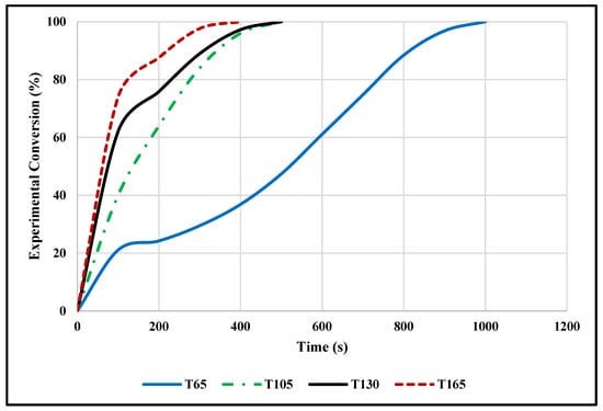 Figure 3 summarizes the recorded temperature profiles resulting from the reaction at different initial system temperatures of 292, 314, 328, and 347 K (65, 105, 130, and 165 °F). For all temperatures, the reaction increased the in situ temperature by around 333.15 K (140 °F). Expectedly, for higher initial temperatures, temperature peaks were reached more quickly compared to lower initial-temperature conditions. The conversion of reactants as a function of time for various initial temperatures is plotted in Figure 4. The time to reach the peak temperature decreased from 1000 s, for an initial temperature of 292 K (65 °F), to around 320 s, for an operating temperature of about 347 K (165 °F).