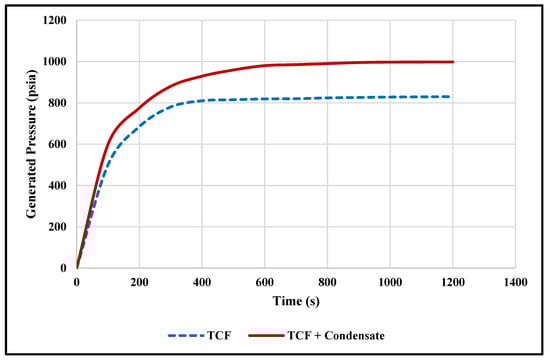 In addition, enthalpy impact on condensate liquids was investigated. Figure 5 and Figure 6 illustrate the temperature and pressure profiles for two selected cases, only TCFs and a thermochemical-condensate system. Higher temperatures were recorded for the pure TCF system, while introducing the condensate liquid into the TCF system led to a reduction of the temperature, measured by around 7.4 K (11 °F) due to the added thermal capacity of the condensate. The condensate properties were changed considerably after the chemical reaction occurred. Rheological measurements substantiated condensate-viscosity reduction from 0.94 to 0.57 cP after TCF injection, amounting to a 39% decrease. Upon injection, generated pressure increased the gradient to push the condensate liquid towards the producing well. Importantly, the pressure generated multiple fractures (Figure 7) in the treated formations, thereby increasing pore-throat size and reducing capillary pressure by up to 51% [25]. The reduction in capillary pressure due to the creation of multiple fractures can be explained by the following equation [25,31]: