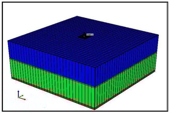 An advanced equation-of-state (EoS) compositional and unconventional simulator (GEM) from Computer Modelling Group (CMG) software was utilized. The used data were collected from the available literature [32,33,34]. Ayub and Ramadan [12] examined reservoirs with respect to the areal extensions and associated drainage areas in the vicinity of the gas-production well. They reported that a 1 by 1 km sector could accurately represent the actual behavior of pressure depletion for a gas-condensate reservoir. Consequently, the reservoir was built around a Cartesian grid covering a square area of 1 km2. Figure 8 provides an overview of the reservoir model used in this work. The initial reservoir conditions are listed in Table 1. Vertical heterogeneity is captured by defining four layers with permeabilities ranging from 5 to 315 mD. On the basis of field data reported by Whitson and Kuntadi [34], reservoir porosity was given with 0.13, initial reservoir pressure with 48.3 MPa (7000 psi), temperature with 408 K (275 °F), and rock compressibility with 3.5e–8 1/Mpa (5.0e–6 1/psia). A single well was completed in the model center, and production simulated for a total of five years. Two wellbore constraints were applied with minimal flowing bottom-hole pressure of 10.4 MPa (1500 psi) and maximal flow rate of 30 MMSCFD.