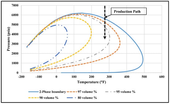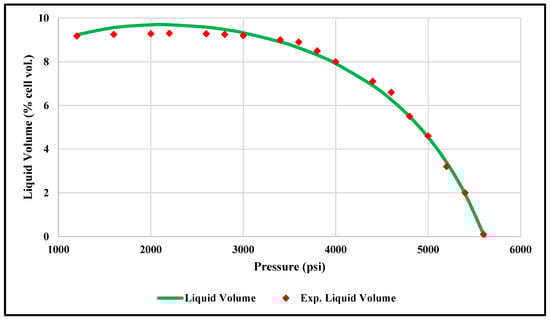 The fluid-property-characterization tool (WinProp) was employed to develop the EoS model on the basis of the Peng–Robinson framework using the fluid composition listed in Table 2. Figure 11 details the resulting two-phase envelope. During production, reservoir pressure decreased entering the two-phase region, allowing for gas and liquid condensate to coexist. Generally, it can be assumed that the gas is produced under isothermal conditions. Heat loss from the reservoir was considered negligible due to the poor thermal conductivity of the reservoir rock and the insulating nature of the overburden formations. Importantly, constant composition expansion (CCE) measurements were used to validate the developed fluid model. An acceptable match was achieved between experiment measurements and simulation results, as evidenced in Figure 12.