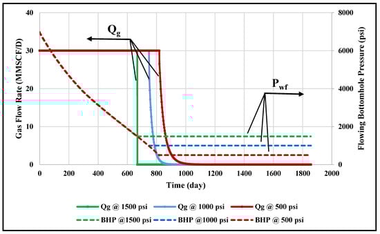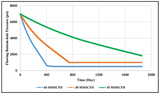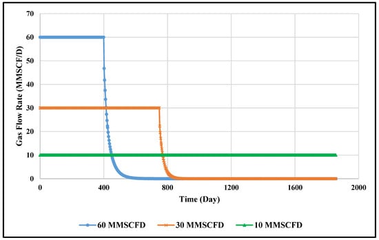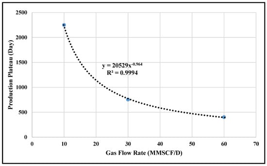 Figure 15 encapsulates gas-production profiles for gas-flow rates of 10, 30, and 60 MMSCFD, respectively. The corresponding flowing bottom-hole pressure profiles are plotted in Figure 16. It can be observed that a constant production rate of 60 MMSCFD could only be sustained for 400 days, with the rate sharply dropping thereafter due to flow impediments associated with condensate banking. Naturally, reducing gas-flow rate from 60 to 10 MMSCFD postpones the onset of liquid dropout. Plotting the duration of the production plateau maintained in days versus stabilized gas-flow rate suggested exponential relation, as indicated in Figure 17.