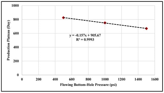 Duration of production plateau plotted against flowing bottom-hole pressure.