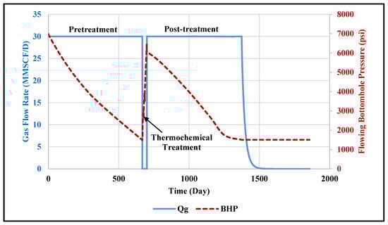 Profiles of gas-production rate and flowing bottom-hole pressure prior to and after thermochemical treatment.