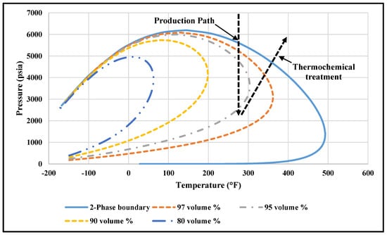 Evidently, gas injection, hydraulic fracturing, or a combination thereof constitute pragmatic approaches to mitigating condensate banking. However, gas injection needs to be executed on a frequent basis to maintain its efficacy. Hydraulic fracturing only delays the inevitable development of a condensate bank. Hence, at some point, gas injection may be required to become part of the reservoir-management process. Needless to say, both gas-injection and hydraulic-fracturing treatments are of great concern with respect to project economics [3,9]. Therefore, in this paper, an innovative condensate-treatment concept based on thermochemical fluids (TCFs) is introduced [3,24,25,26,27]. Exploiting enthalpy associated with the thermochemical reaction allows for remarkable increases in pressure and temperature to be realized downhole [28,29]. The suggested treatment exhibits an attractive performance profile that can combat condensate-banking-related challenges for various types of gas reservoirs associated with carbonate, sandstone, and shale formations [27,30].