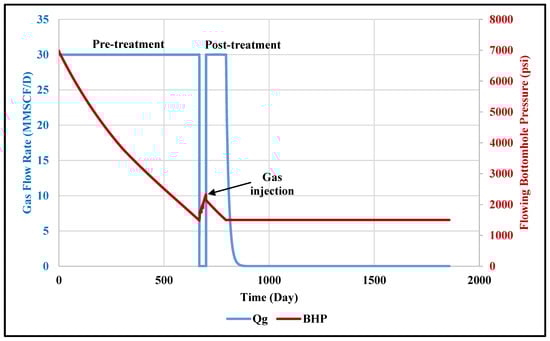 Profiles of gas production and associated flowing bottom-hole pressure before and after gas-injection treatment.