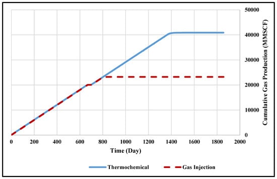 Cumulative gas production is plotted in Figure 21. The conventional approach only allowed for a production of 23.2 MMMSCF, equivalent to total gas recovery of about 25% of hydrocarbons in place. In contrast, the application of thermochemicals improved gas recovery by a factor of 1.76 to 40.8 MMMSCF, corresponding to a total recovery of about 89% of the gas in place. Given that the injected gas had a similar composition to that of reservoir fluids, no chemical reaction was expected, and only condensate revaporization took place. Gas injection only increases pressure in the near-wellbore region, fostering the revaporization of the condensate liquid, thereby improving gas flow into wellbore [16,17]. Thermochemical injection, however, not only increases pressure, but also reduces capillary forces and decreases condensate viscosity [24,25,26,27].