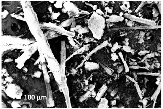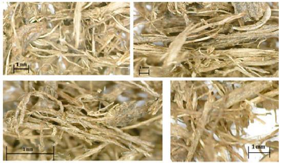 From licorice root, glycyrrhizin was extracted using an ethanol/water (1:1, v/v) solvent, with a sample to solvent ratio of 1:5 (w/v), during 1 h: residues obtained after extraction were supplied by Amarelli and Fallani, Rossano Calabro, Italy, and their use as a filler in a composite is the objective of this study. Before starting any use, the material was stored for a period of around 6 months. The aspect in which the material was before milling is reported in Figure 1; some agglomeration of fibrous structures is visible, while on the other hand, in some cases, ribbon-like thinner parts are also visible. It is also likely that the extraction of glycyrrhizin was not complete, since some blackish staining on the fibers is also noticeable. To prepare them for introduction in the resin, checking that the material did not include pieces with dimensions larger than 10 mm, they were suitable for ball milling. Therefore, the root residues were milled for 2 h using a Retsch PM 100 planetary ball mill with a 250 mL chamber in agate and equipped with 10 zirconia particles with diameter 10 mm as milling agents.
