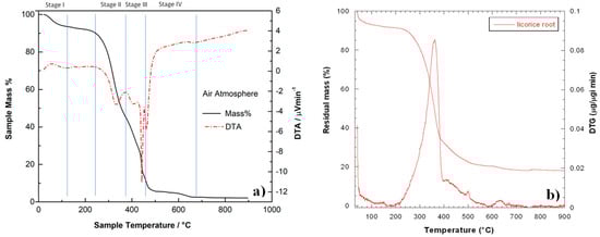 Weight loss of licorice root residue sample during heating rate at 10 °C/min under air (a) and nitrogen (b) flow.