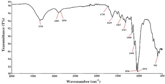 The major absorption peaks for the present study are selected as follows (Figure 4): the -OH stretching is represented by very strong peaks at 3336 cm−1, as well as the established aliphatic -CH and -CH2 stretching at 2856–2904 cm−1. The non-conjugated -C=O in hemicellulose stretching vibration absorption peak is seen at around 1738 cm−1, while the absorption peak at around 1629 cm−1 is assigned to aromatic skeletal vibration allied to the out-of-plane stretching of aromatic –CH. The peak at 558 cm−1 is assigned to C–OH out-of-plane in cellulose [30], while those in the region from 1031 to 1160 cm−1 are assigned to the -C-O stretching vibration in holocellulose, and the peak at 1427 cm−1 is assigned to the -CH, -CH2 bending of aliphatic carbons. The small intensity of peaks at around 1738 cm−1 shows a very low holocellulose to lignin ratio [31]. The strong peak of licorice root at 1316 cm−1 indicates the high proportion of syringyl units in lignin, combined with the 1629 cm−1 peak. This appears different from other roots, as reported from Wang et al. [32], who reported instead on those with a high amount of guaiacyl units.