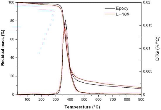 Thermogravimetric tests results in nitrogen atmosphere of pure epoxy and 10% licorice waste composite (L-10%).
