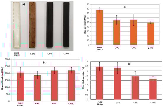 (a) Examples of the four series of samples tested; (b) flexural strength (average and standard deviation) results; (c) flexural modulus (average and standard deviation) results; (d) flexural maximum strain (average and standard deviation) results.