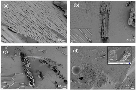 Scanning electron microscopy (SEM) images of fracture surfaces, reported in Figure 8, are especially focused on controlling the formation of an effective interface between the filler and the resin. This is particularly observed from the accommodation of the resin strain, which appears as such in Figure 8a, and by the different amounts of filler introduced, 1, 5, and 10 wt%, in Figure 8b–d, respectively. Here, again, the most promising situation appears to be shown by the intermediate amount of filler, hence 5 wt%, where the most interesting modification with respect to pure epoxy is revealed. In contrast, there is a notable effect of the filler orientation in the case of 1 wt%, and a noteworthy presence of air inclusions, which are likely to be due to the difficult introduction of a possibly excessive amount of filler, in the case of 10 wt%.