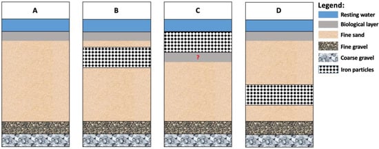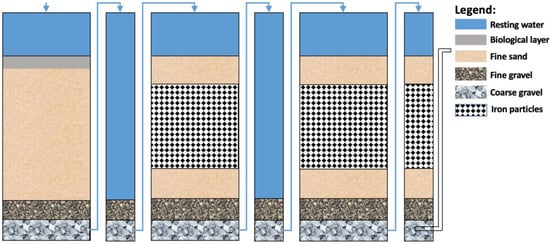 To better understand the impact of preferential flow paths, the time-dependent changes in a Fe0 filter should be considered. A Fe0 filter is initially (t0 = 0) very porous and the pores are all inter-connected, like in a sand filter. As iron precipitates are in situ-generated over time (t > t0), the available pores (locally) increasingly become less and less inter-connected. In the short term, there is a local clogging mainly in the entrance zone, meaning that the system is still largely porous but less permeable [,]. When the permeability within a Fe0 filter is significantly reduced over time, preferential flow paths are formed throughout the filter. In the absence of an equalizing water column, these preferential flow paths significantly lower the effectiveness of the Fe0 filter within the same water column and even in subsequent columns. Therefore, to eliminate the propagation of preferential flow from one unit (e.g., BSF or Fe0/sand filter) to the next (e.g., Fe0/sand filter), equalizing filters should be used (Figure 3).