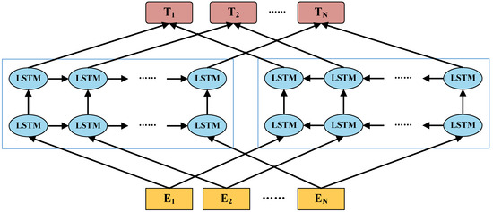 where represents the parameters represented by the token, and represent the LSTM parameters in the bidirections, and represents the parameters of the softmax layer. For token i in each layer, we can calculate representations, as shown in Equation (5).