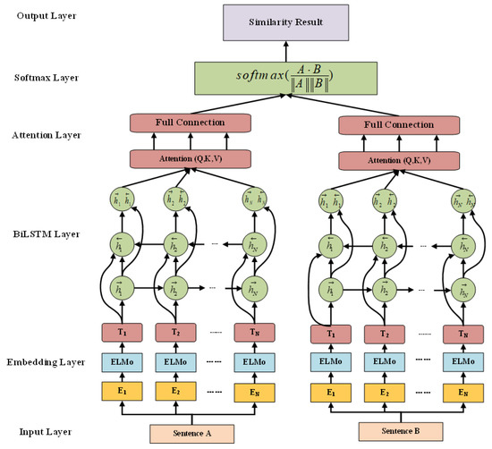 where is the dimension of the dot product of Q and K scaled by k. Q, K, and V are calculated from the same input, which is represented by BiLSTM in this model. Cosine similarity is used to measure the similarity of text. Equation (13) represents the text similarity.