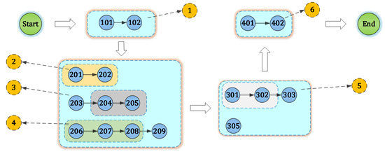 A part consists of different features, and each of them has several serial or parallel relationships. Many manufacturing features have evolved. Figure 5 shows the manufacturing process model with six MPUs. For MPU 1, the processing unit 101 is in the front and processing unit 102 is in the back; MPU 2, MPU 3, and MPU 4 belong to a parallel relationship. A directed acyclic graph consists of several nodes and arcs, and there is no closed-loop; this is called the sequence of process units.