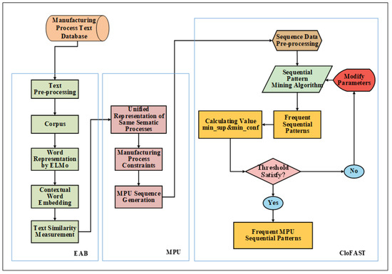 This paper has proposed a frequent closed sequential pattern mining algorithm based on the text contextual semantics of the manufacturing process and the manufacturing process rules (EABMC). This algorithm aims to obtain frequent sequence relations of product manufacturing processes to help with the identification of factors affecting product quality and to improve the product quality. We used EAB to merge semantically similar sequential texts, and we utilized the MPU to deal with sequences containing simultaneous occurrences and to reduce impurities in the manufacturing sequence. To get a good mining result, particularly when the volume of the processed data is large, we chose a closed sequential pattern mining approach to decrease the number of sequences beyond the threshold and to pick out long sequences and we proposed the use of a processing unit that consists of common match processes to reduce the amount of computing and calculating time required. A longer sequence contains a higher amount of manufacturing information. Process design relies heavily on the designer’s process knowledge and related experience. The suggested method tries to avoid these human factors. The method sets threshold support values according to the mapping relationship between the account of closed frequent sequences and the support threshold min_sup. In the proposed manufacturing process method, the threshold support value is dynamically adjusted for manufacturing situations, such as for different categories, according to the data connected to the manufacturing database. The generated closed sequential patterns may change depending on the different manufacturing situations, e.g., the category, precision, or personalization. Compared with other methods, this method has a higher level of efficiency and better performance. This paper will help the manager make decisions to improve product quality and find important factors related to production and manufacturing that affect product quality.