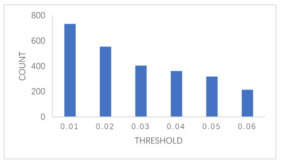 The data set obtained by the preprocessing steps was used as a specific data set for determining the support threshold, the CloFAST algorithm was applied, and then the judgment result of the support threshold was obtained. The results are shown in Figure 7.