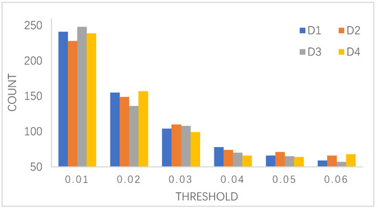 The dataset was divided into two data sets, D1 and D2, randomly. The CloFAST algorithm was applied to obtain the results shown in Figure 6. When the dataset was reduced to half of the original size; D1 showed the first extreme point of value m at min_sup = 0.04, while D2 showed the first extreme point of value m at min_sup = 0.04. Then, the dataset was randomly divided into four data sets: D3, D4, D5, and D6. The CloFAST algorithm was applied, and it showed that the first extremum point appeared when min_sup = 0.04 for all four data sets, as shown in Figure 8. Therefore, based on the observations from Figure 7, the minimum support value was set as 0.4 in the following experiment.