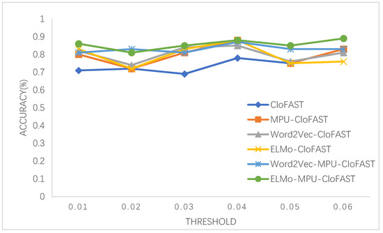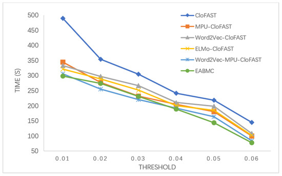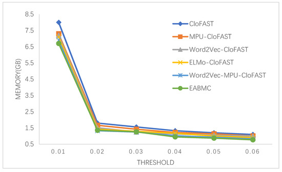 To verify that the performance of the improved method is superior to the traditional algorithm, we compared the proposed EABMC with CloFAST, MPU-CloFAST, Word2Vec-CloFAST, ELMo-CloFAST, and Word2Vec-MPU-CloFAST in terms of the accuracy rate (shown in Figure 9), running time (shown in Figure 10), and memory consumption (shown in Figure 11), according to the dataset configuration and after varying the support threshold. In terms of the three main indexes of data mining, EABMC generally outperformed all of the other systems for almost every support value when the number of frequent sequences was higher.