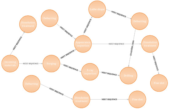 The sequence relations obtained by the EABMC algorithm were visualized, and the sequence relation visualization is shown in Figure 12. The visualization revealed a clear temporal direction between the manufacturing processes. The knowledge graph includes all procedures that lead to the reduction of wheel hub quality and the direct connection of each procedure, which can make the enterprise more intuitively understand the factors that lead to the reduction of product quality.