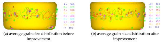 After correcting the factors that lead to the reduction of wheel hub quality obtained by the sequential pattern mining algorithm, the wheel hub is manufactured again. The analysis software is used to compare the effect before (shown in Figure 13a) and after (shown in Figure 13b) improvement. From the average grain size distribution in Figure 13b, it can be seen that, compared with the original scheme, the uniformity of hub grain refinement in the optimization scheme is significantly improved.
