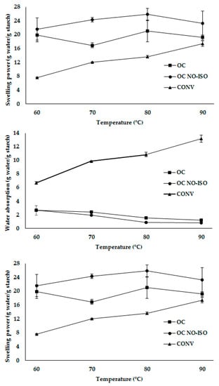 The CONV starch shows a normal behavior with temperature increases (60–90 °C) showing an increase of solubility of 12.8 to 24.3%, WAC of 6.7 to 13.2 g/g and SP of 7.7 to 17.4 g/g. Similar results were presented by dos Santos et al. [12], Chel-Guerreo [15] and Silva et al. [26] with avocado seed starch obtained by conventional methods. Contrary to the MAE starches have completely different behavior when compared with CONV starch and other authors. The MAE starches have a high solubility and increase with the temperature of 60 to 90 °C, the solubility increases of 86.3% and 93.2% to 93.6% and 96.8%, in OC and OC NO–ISO starches, respectively. Consequently, the starches have a low WAC, between 1–2%, decreasing with the increase in temperature as a consequence of the increase of solubility. The high SP of MAE starches, which had no significant fluctuation with temperature, can be explained by the MAE effect in the structure of the starch. As shown in Figure 2, the MAE starch has a small size and probably these starches are small structures of amylose and amylopectin with many cleaved bonds that promote a rapid water bond and a high SP, due to the relation between a large number of water molecules by starch particle, however, the WAC is low due to the low quantity of these particles associate to the high solubility and the small particles gelatinized when compared with large size of a gelatinized granule of CONV starch.