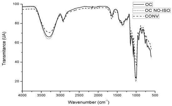 FTIR spectra of MAE avocado starch of optimal condition (OC), optimal condition non-isothermal mode (NO–ISO) and conventional extraction (CONV).